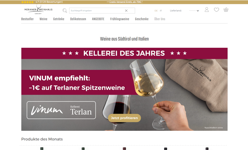 Vor Kurzem hat das Team von 426 die Entwicklung des Shops abgeschlossen. Ziel von Meraner Weinhaus ist es, für ganz Südtirol ein Referenzpartner in Sachen Qualität zu werden. So haben wir den Shop durch die Implementierung von personalisierten und zeitgemäßen Grafiken weiterentwickelt.