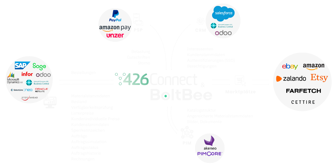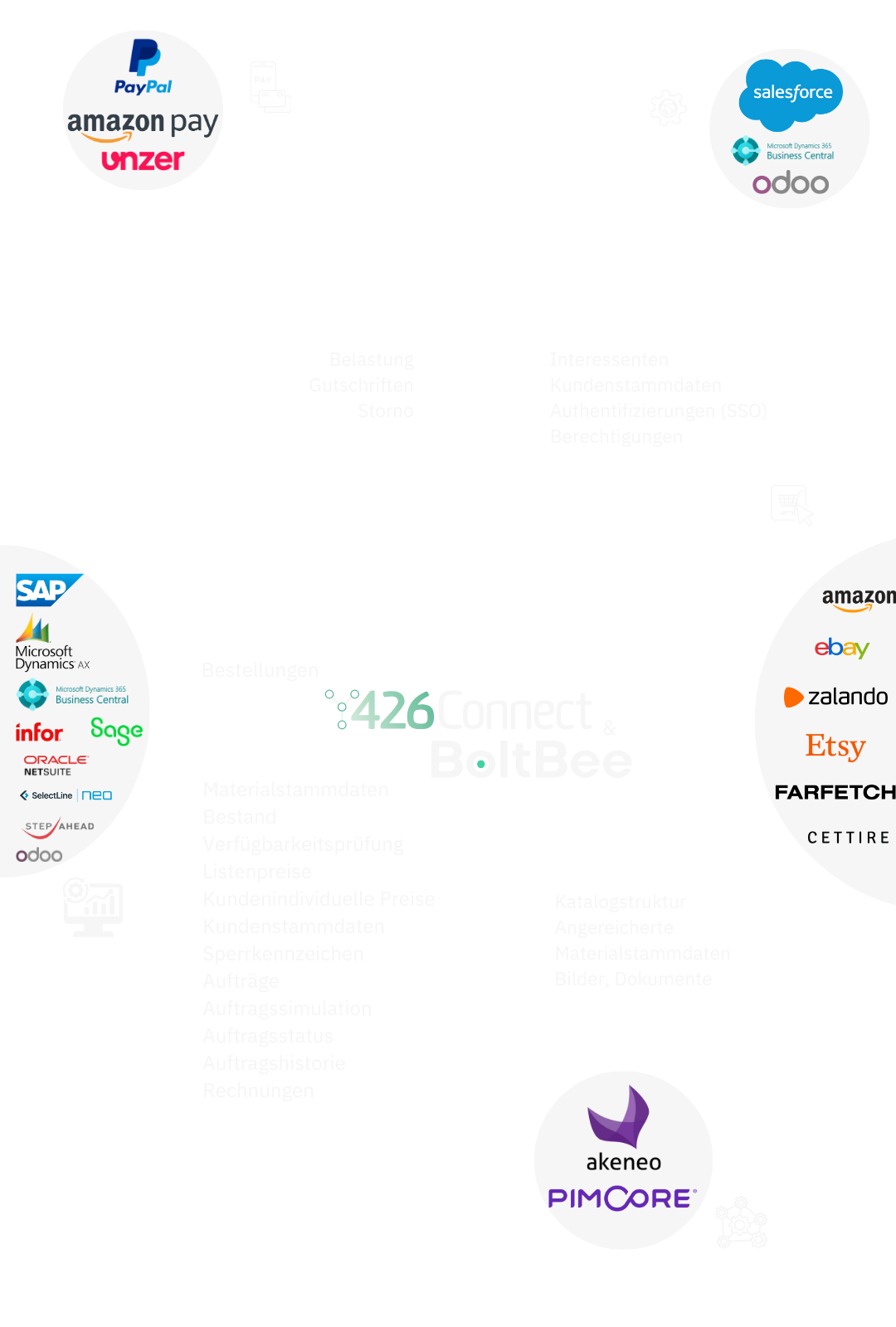 Unsere hauseigene Middleware 426Connect bildet das Herzstück vieler Integrationsprojekte. Sie verknüpft ERP-, PIM- und CRM-Systeme zuverlässig mit relevanten Marktplätzen und sorgt für reibungslose Datenströme. Durch die modulare Architektur ist sie besonders anpassungsfähig und skalierbar – ideal für wachsende Multichannel-Strukturen.