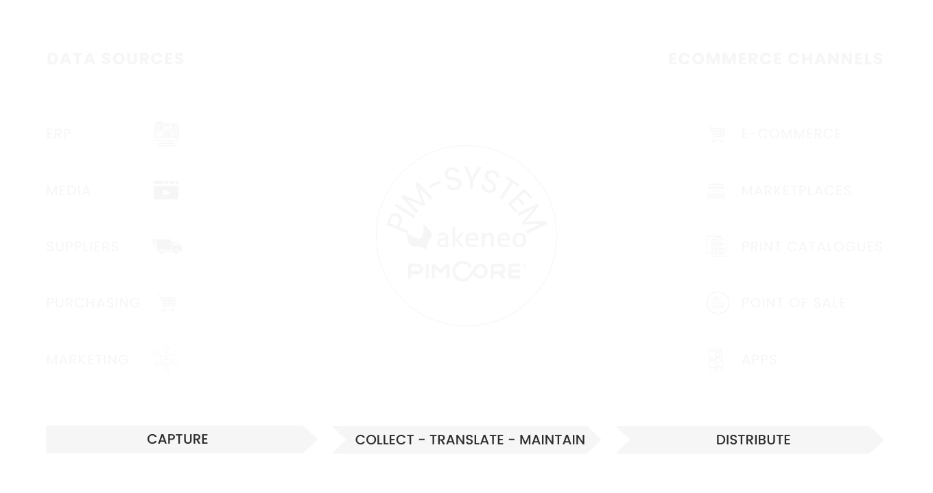 Dopo aver analizzato il tuo sistema attuale, lascia che il nostro team di sviluppo si occupi della consulenza e dell’integrazione PIM per adattarlo alle tue esigenze. Il PIM è compatibile con tutti i sistemi più diffusi sul mercato. Tuttavia, se in alcuni casi mancasse un'opzione di connessione, sviluppiamo l'interfaccia API necessaria. “Se non esiste, lo sviluppiamo per te” è il motto del nostro team.