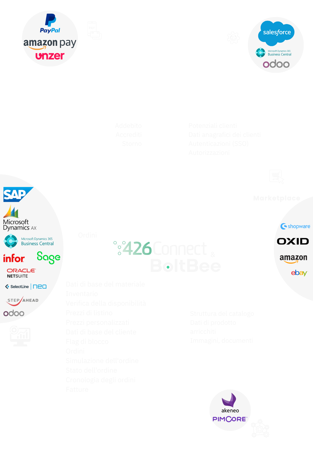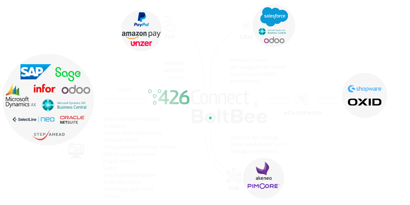 - Connessione fluida: ERP ↔ shop, CRM, PIM...